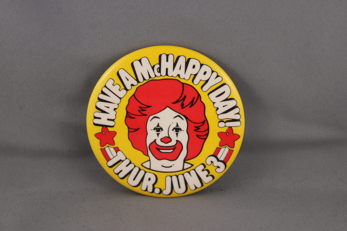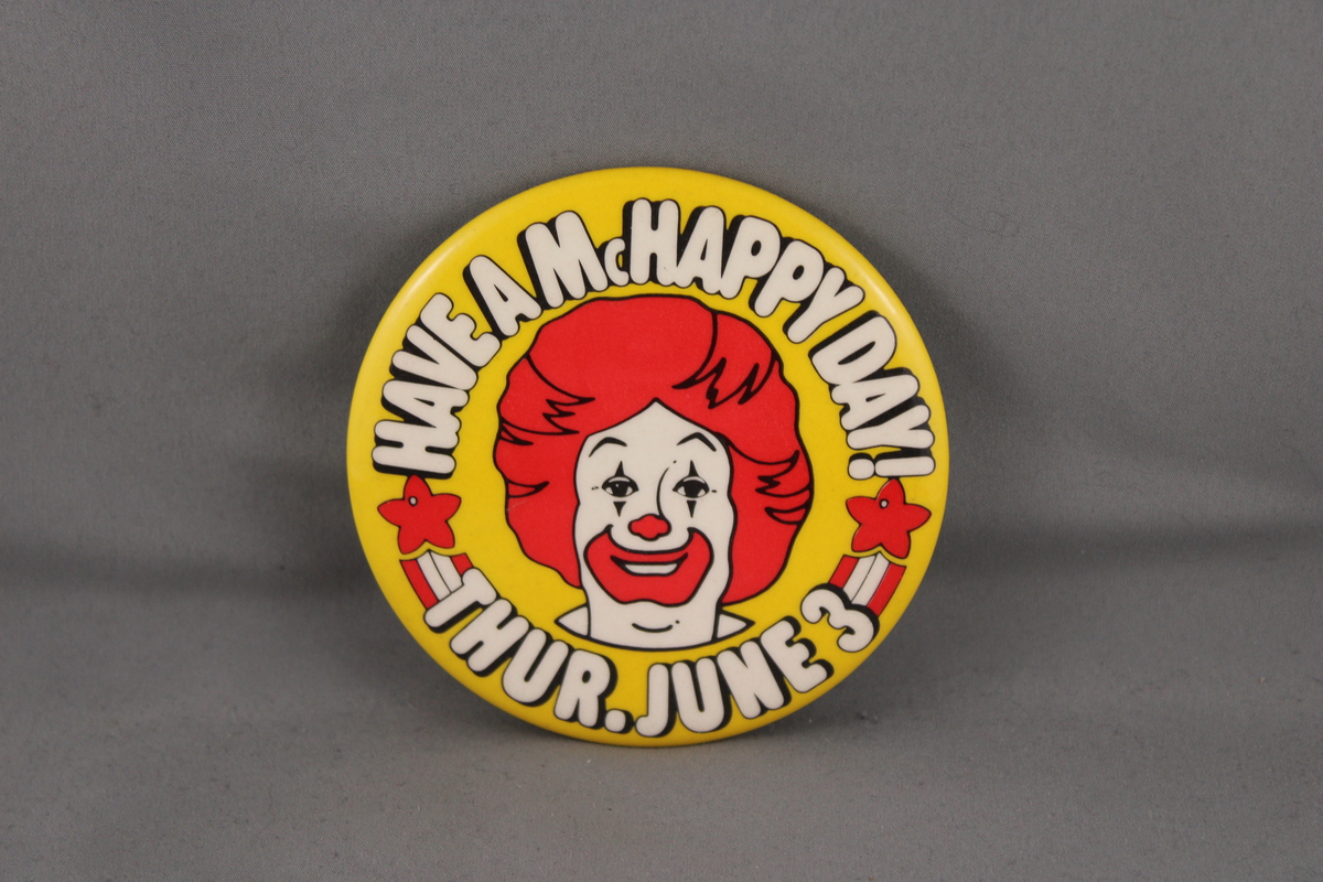 Up for sale is a vintage McDonald's. It has a yellow base colour with a face picture of Ronald McDonald screened in the middle. Around the grpahic it has Have a McHappy Day June 3 screened on. What a great pin do not miss out on it.
