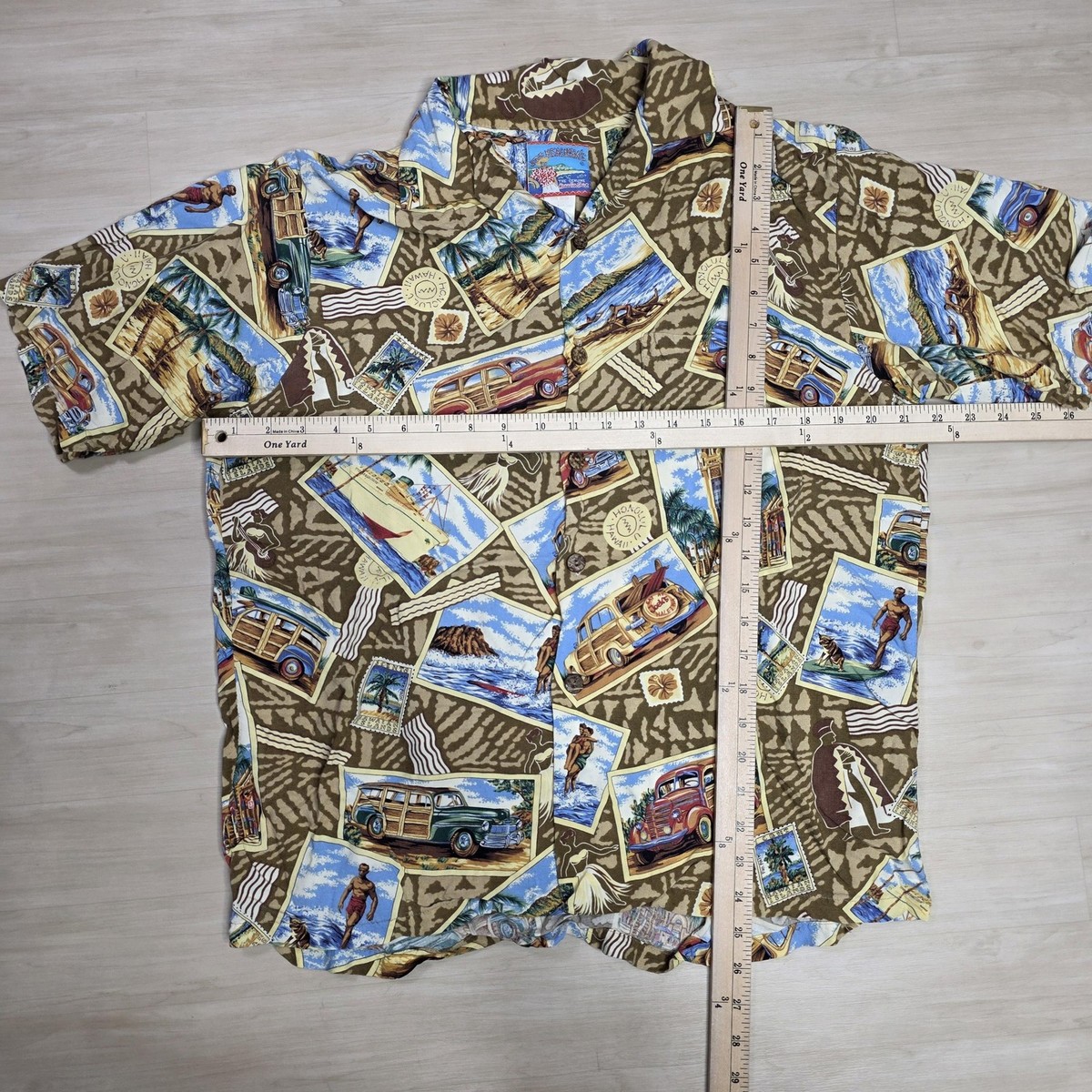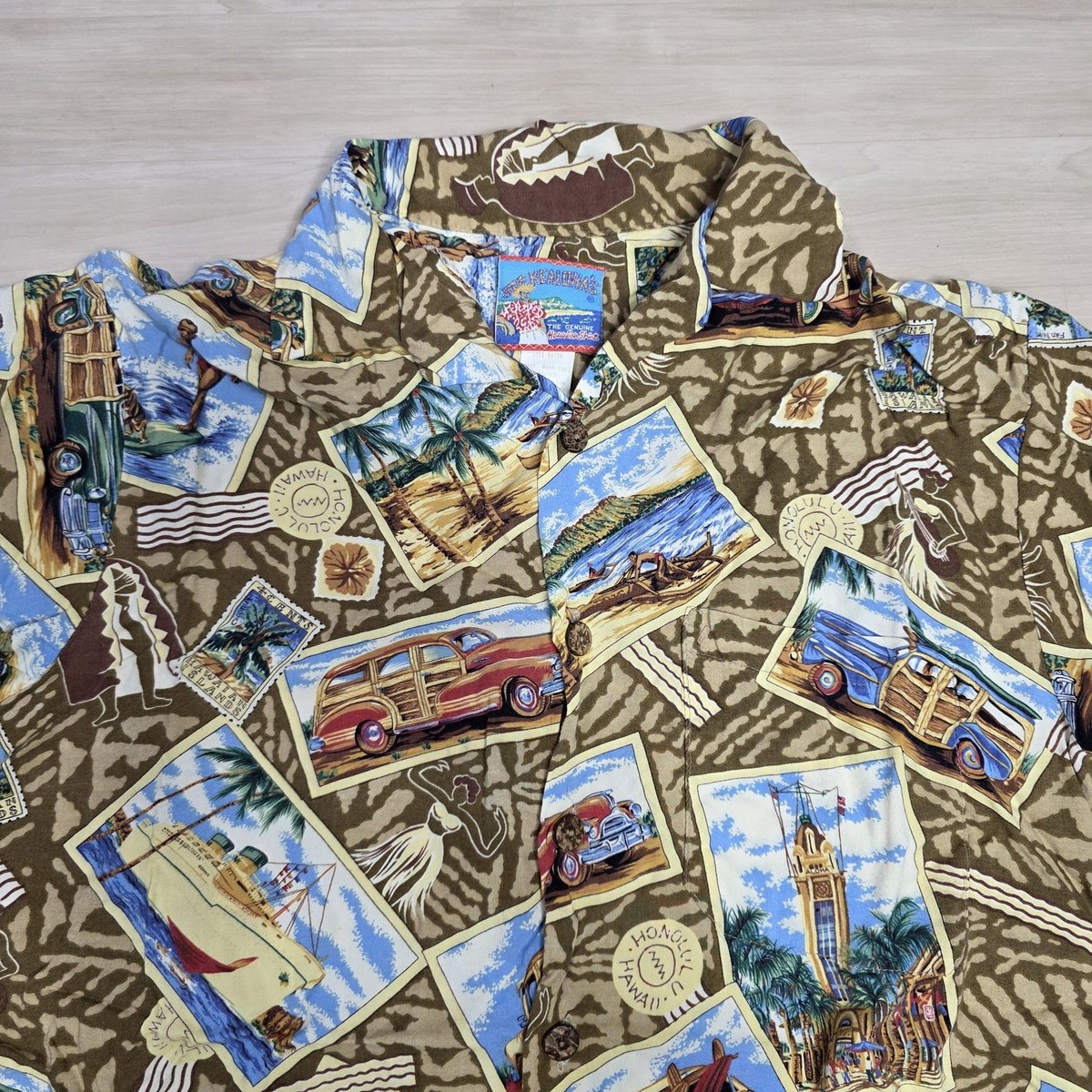 Subject: Classic Hawaiian Aloha camp shirt featuring postcard-style scenic prints with surfers, palm trees, beaches, and vintage woody surf wagons over a brown/tan tropical pattern.