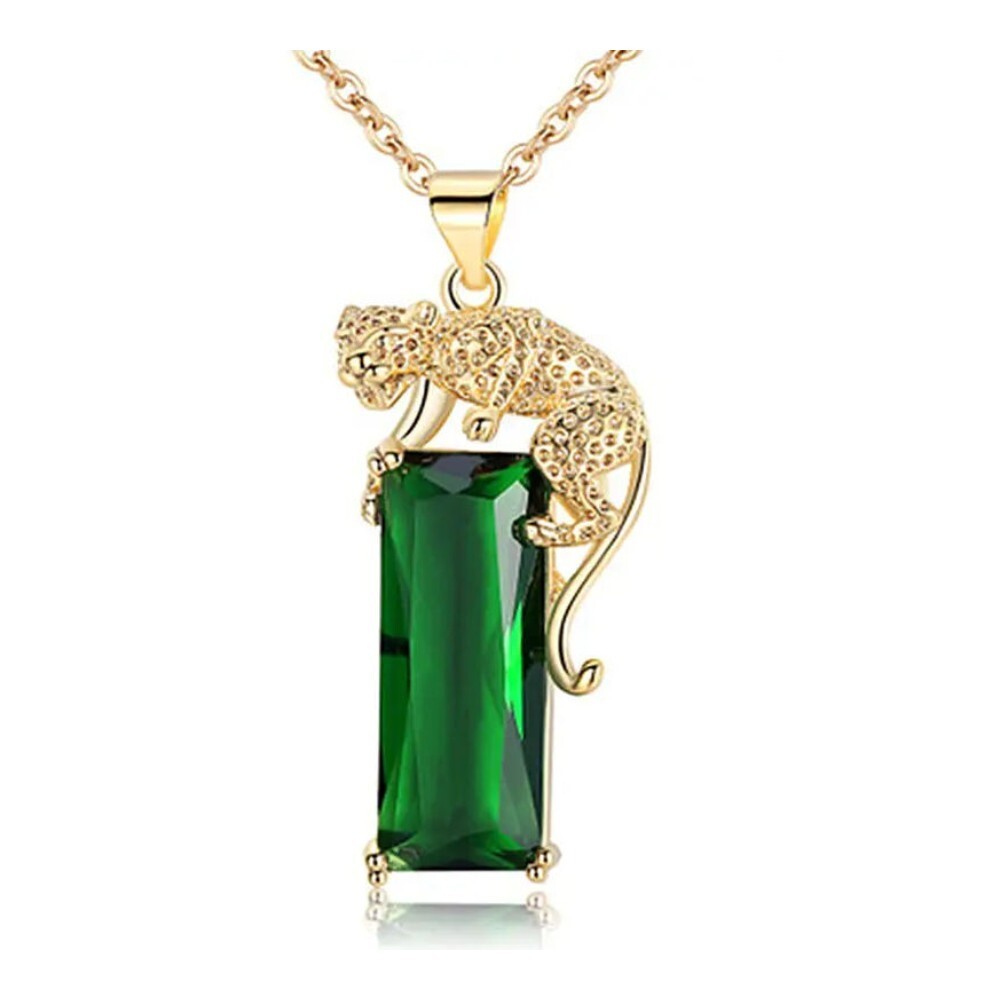 Il prodotto e una collana con pendente in vetro verde con un design che ricorda uno smeraldo e presenta un motivo leopardato maculato. Il colore principale della pietra e il verde e il materiale e il vetro. Lo stile della collana e pendente, rendendolo un accessorio unico e accattivante per ogni individuo alla moda. L'articolo viene fornito con catena placcata oro 14k
