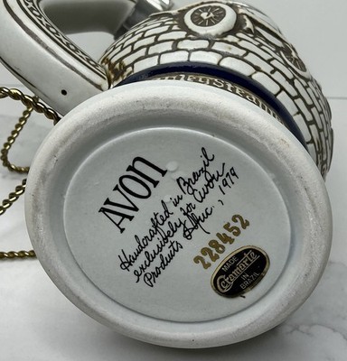 This vintage 1979 Avon beer stein features a unique design of handcrafted ceramic made in Brazil. The round stein comes in a multicolor scheme with an embossed automobile theme, making it a perfect collectible for car enthusiasts. The beer mug can be used for both hot and cold beverages and includes a matching lid for a secure seal. The 1970s style stein is a one-of-a-kind original piece that adds a touch of nostalgia to any barware collection. Number 228452 excellent condition, clean