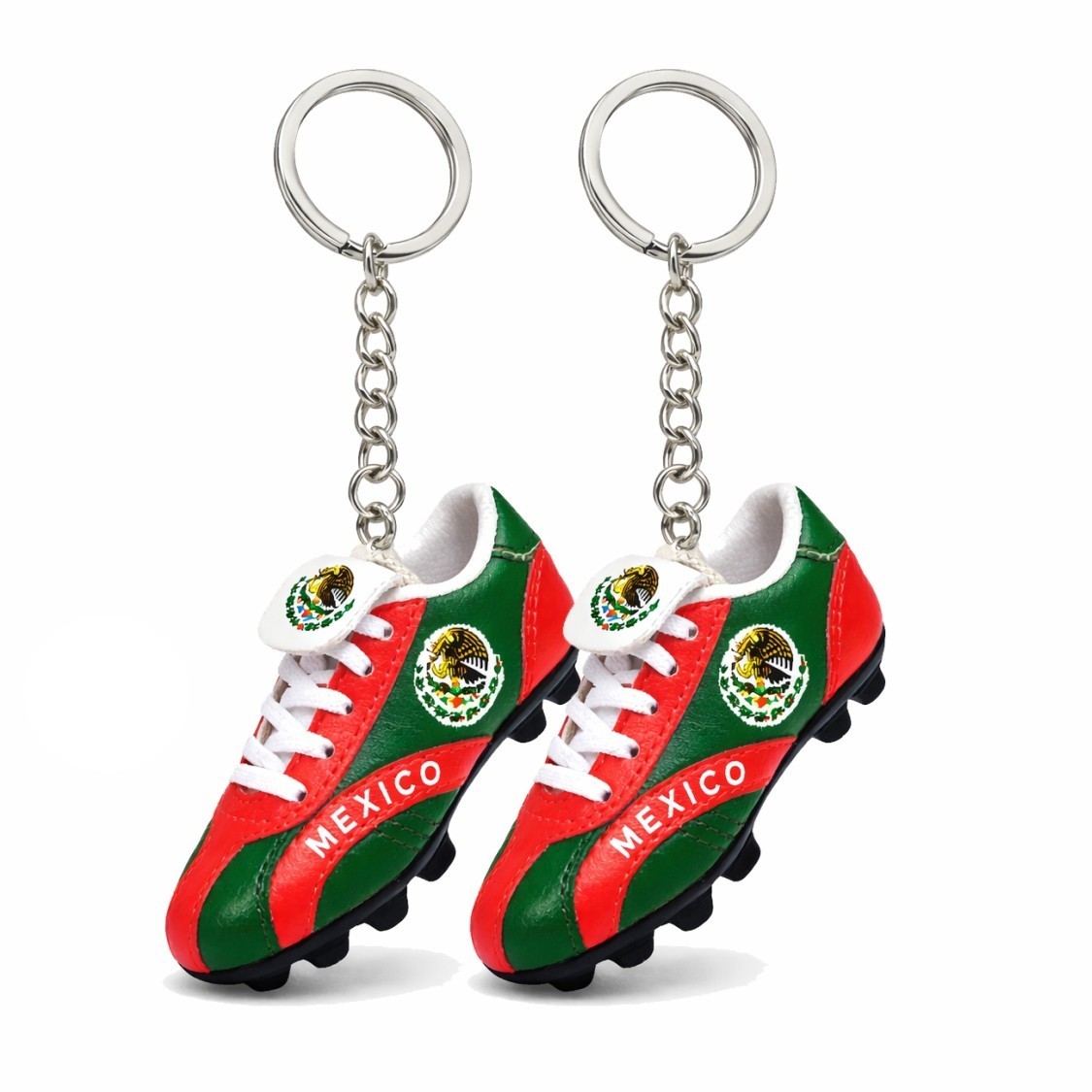 Show your pride everywhere you go with this detailed Mexico soccer cleat keychain! Designed in the iconic green, white, and red colors of the Mexican flag, this miniature football Cleats features the national emblem and ?MEXICO? printed on the side for an authentic look.