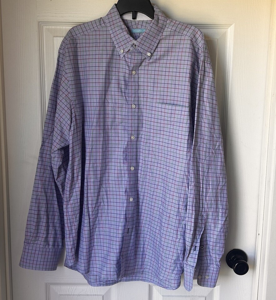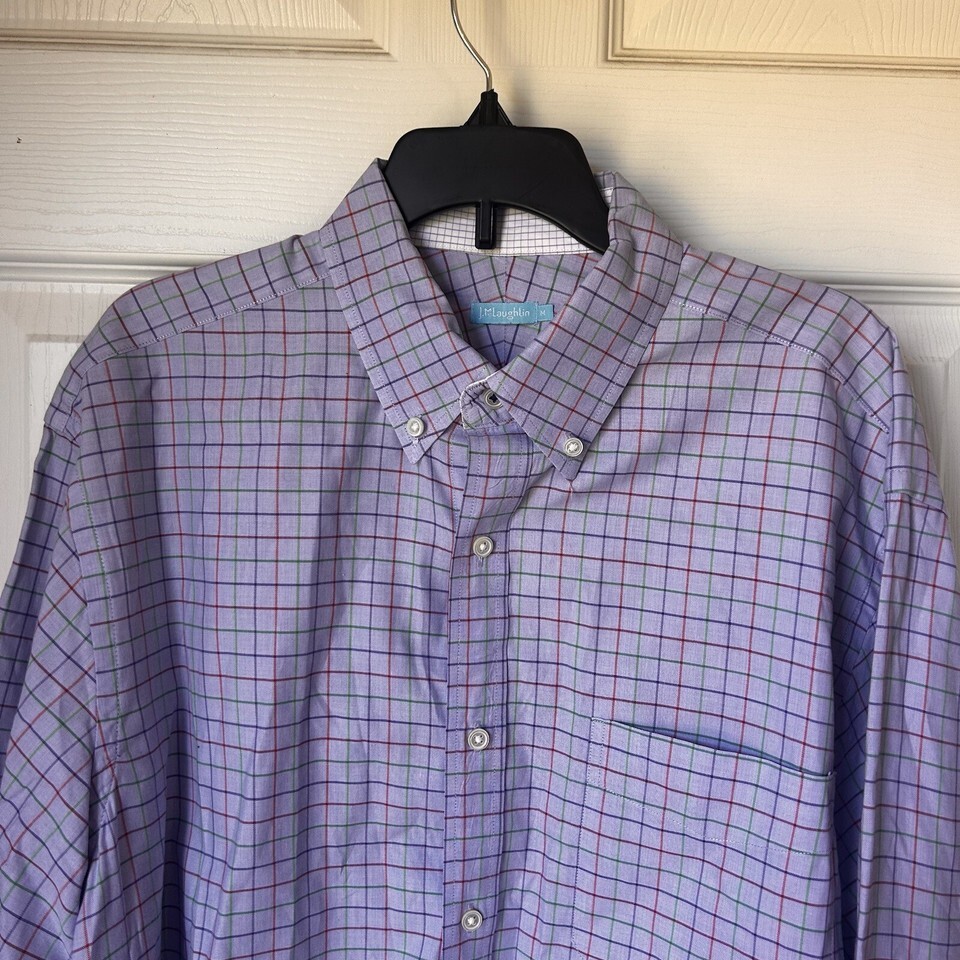 J McLaughlin Men's Dress Office Shirt. Blue Plaid. Button Down. 100% Cotton. Size Medium. 22" pit to pit. 29" in length.
