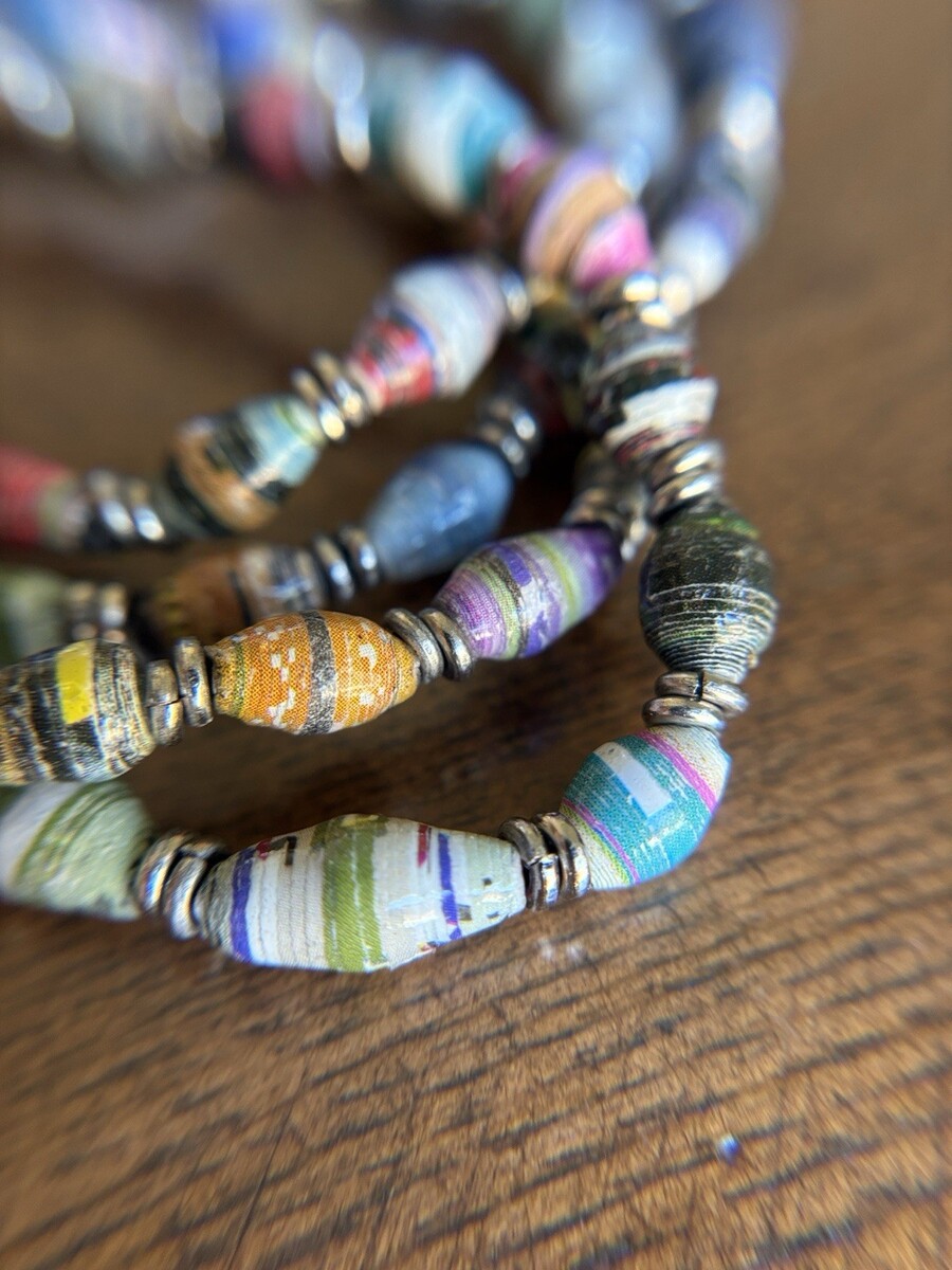 Crafted in the tradition of Ugandan artisan jewelry, these beads are hand-rolled from recycled paper ? likely colorful magazine pages ? then lacquered for durability and a beautiful finish. No two beads are exactly alike, making this a truly one-of-a-kind piece.