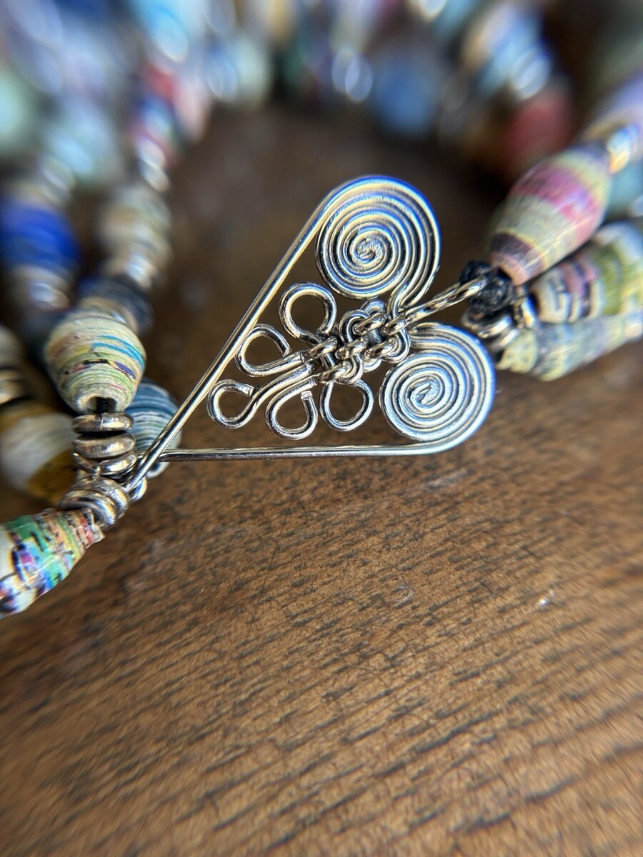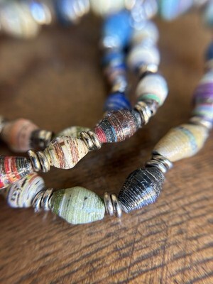 ? Beads: Hand-rolled recycled paper, multicolor with greens, blues, oranges, purples, pinks