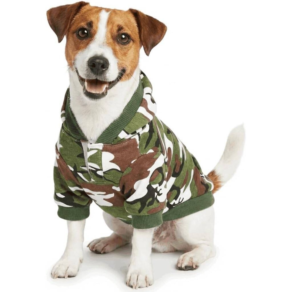 Dress your pet in rugged style with this Dazzling Dog camouflage hoodie. Crafted from a soft sweatshirt material with a cozy fleece-like interior, this pullover features a classic woodland camo print in green, brown, and tan. The design includes a functional hood, ribbed knit cuffs and hem for a secure fit, and a convenient hook-and-loop closure at the neck for easy dressing. Perfect for keeping small dogs warm during outdoor adventures or casual walks.