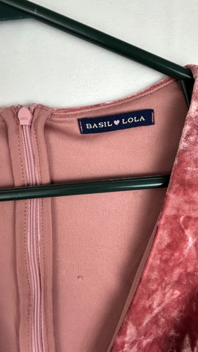 Beautiful Basil Lola crushed velvet dress in a dusty rose/mauve pink color. This flattering fit-and-flare (skater-style) dress features a deep V-neckline in front and back, a fitted waist, and a softly flared skirt. The velvet fabric has a gorgeous sheen and a comfortable stretch, making it perfect for parties, weddings, holidays, or special occasions.