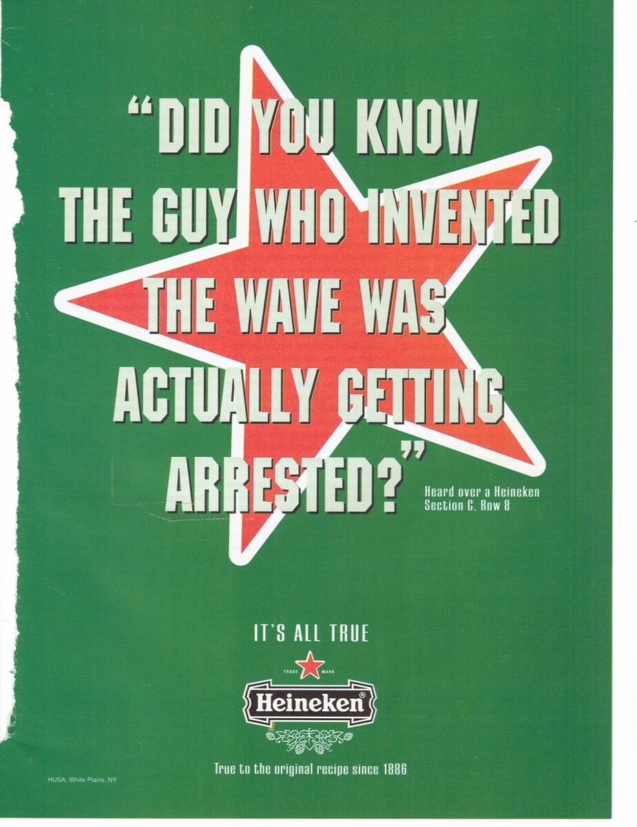 For Sale is a Rare and hard to find 1994 Heineken beer Print Ad Vintage 8.5" x 11". it in good used condition as seen in the pictures provided what you see is what you will receive. Please ask Any and All Questions prior to purchasing. Fast Same or Next day shipping with Free Delivery Confirmation within the U.S. Payment Due within 7 days of purchase (if you need more time please let us know In advance) we love to combine shipping is always a Yes and Most of the time Additional Items Ship for free.