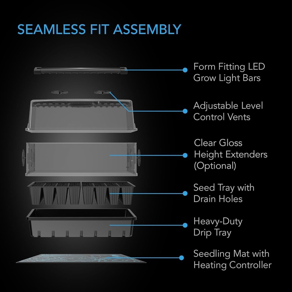 Set Includes: Humidity Dome,Grow Light Bars,Seedling Mat,Drip Trays,Height Extension Panels