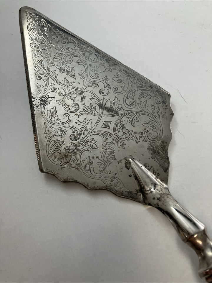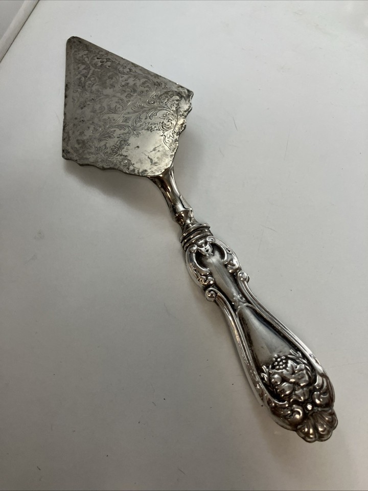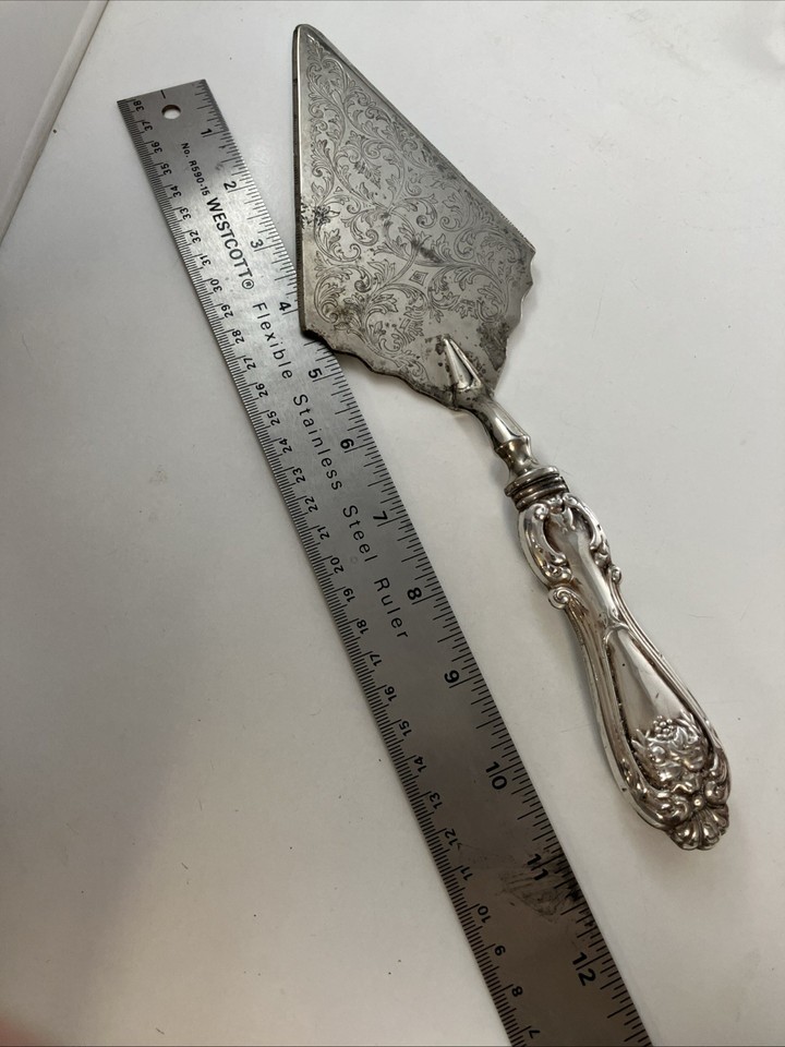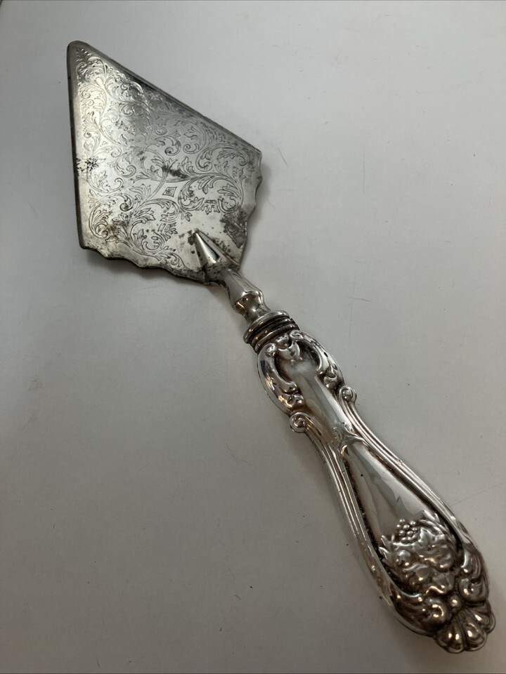 Listed is a vintage Raimond Italian sterling silver handle cake server featuring ornate embossed scrollwork on the blade and a decorative handle. It measures approximately 11.5 inches in length. The blade is silver-plated while the handle is sterling silver.