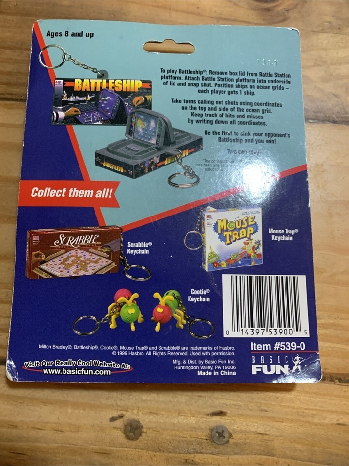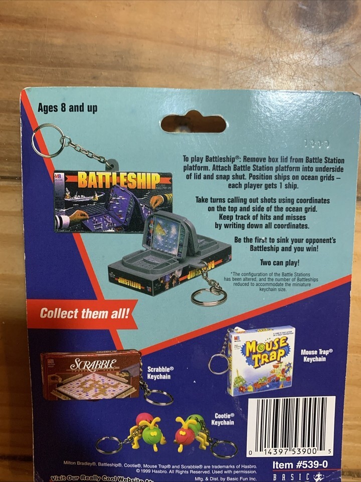 The Battleship Keychain is a mini travel board game produced by Basic Fun in 1999. This compact game allows players to enjoy the classic Battleships game on-the-go. The keychain makes it convenient to bring the game with you wherever you go, making it a fun and portable activity for both casual play and as a stocking stuffer. Enjoy hours of entertainment and strategic gameplay with this nostalgic and compact Battleship Keychain.