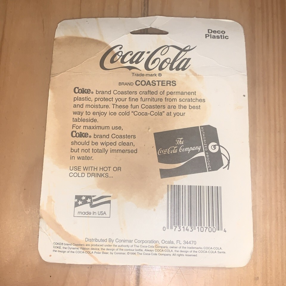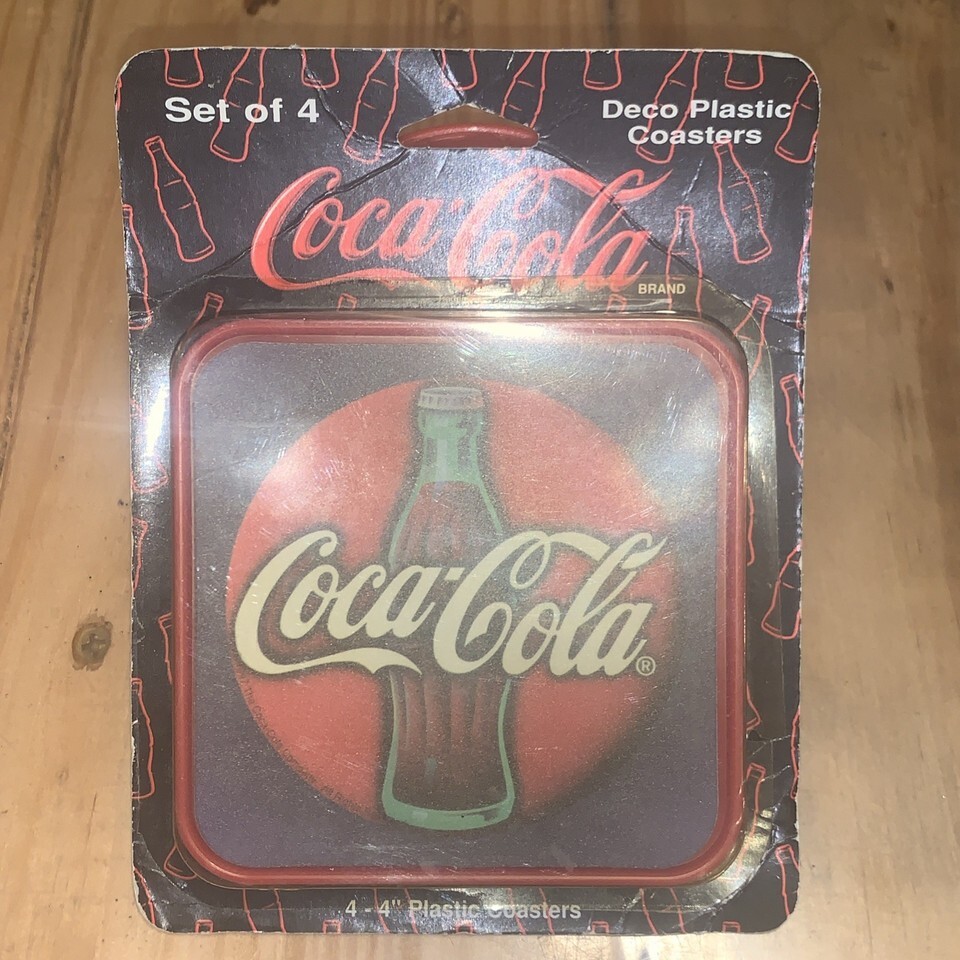 The product is a set of 4 vintage Coca-Cola plastic drink coasters from 1996. These coasters feature the iconic Coca-Cola branding and advertising in a multi-color design. Made in the United States, these original coasters are perfect for collectors and fans of retro soda memorabilia. The coasters are a great addition to any Coca-Cola enthusiast's collection, adding a touch of nostalgia to any dining or entertaining space.