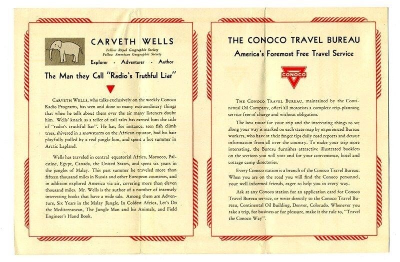 A 12 panel fold out Exploring America with Conoco Carveth Wells Station Log. Includes: information on Carveth Wells. the Man they Call Radios Truthful Liar and his radio show, information on The Conoco Travel Bureauu, A radio Log of Stations where the Radio Program is aired a 1933 Calendar with the dates of Conoco Programs in red, and a United States Map by Conoco. In fine condition,