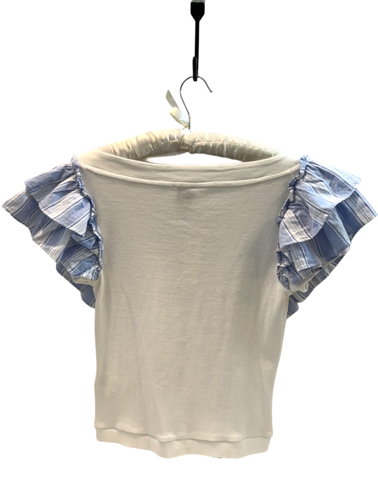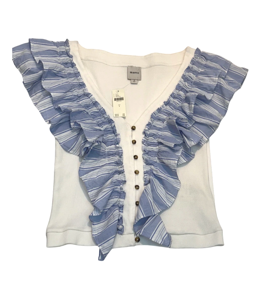Maeve Anthropologie Top Women Small White Blue Stripe Flutter Cropped Cotton
