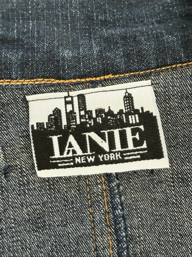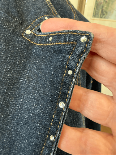Lanie New York, dark blue denim two button blazer with notched collar and large flap button hip pockets. Decorative band at the back waist. The buttons are stamped metal like traditional denim buttons and the pockets, collar and back tab are all trimmed in rhinestone. Laying flat measures 25 inches shoulder to him and 22 inches armpit to armpit. The only tag is the brand tag. There is no size or fabric content tag, but this is an extra large. Please double check measurements to ensure the proper fit for you