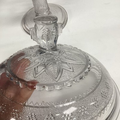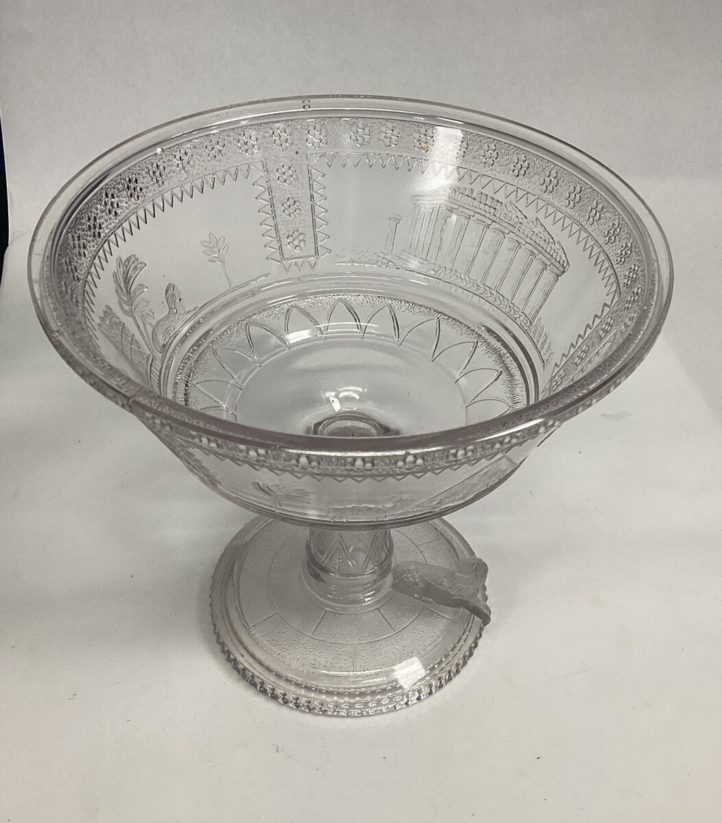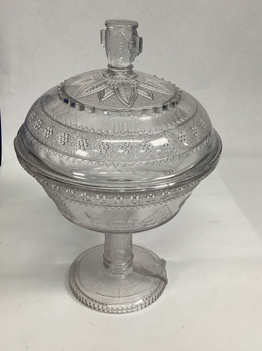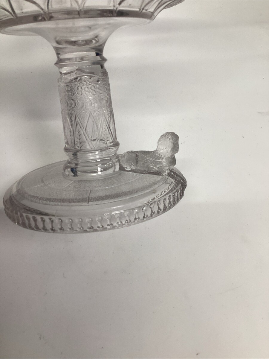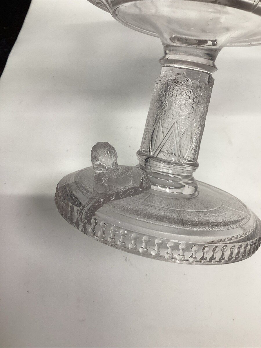 EAPG Adams Glass Co's Egyptian Oasis Pattern Covered Compote - Sphinx - 12?H to the top of the lid. The bowls themselves itself measures 7.25?Hx8?Dx3.25? Deep. There are are a few chips on both the interior lid edge and the top bowl lip. Please see all pictures for damage. In good condition otherwise.
