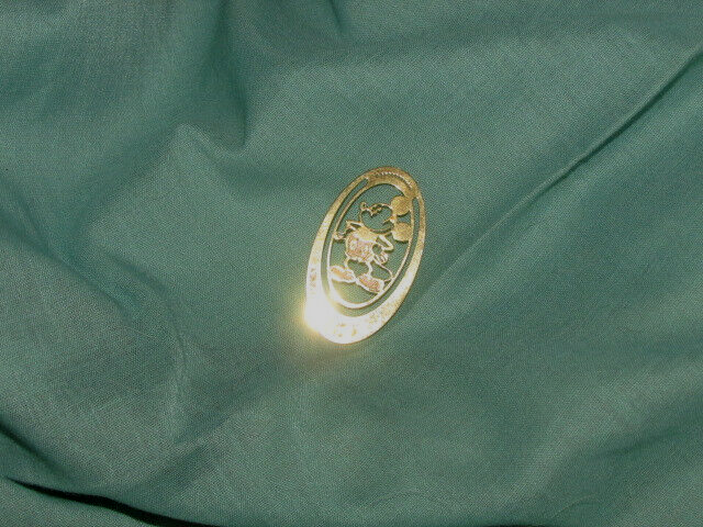 This gold oval medallion features the beloved character Mickey Mouse in his classic cream pants and shoes. The medallion measures 1 3/4 x 1 inch and is perfect for collectors of Disney souvenirs and memorabilia. The design is detailed and of high quality, making it a great addition to any collection. It is perfect for display or as a gift for a Disney enthusiast. The medallion is in excellent shape and is sure to bring joy to its new owner.