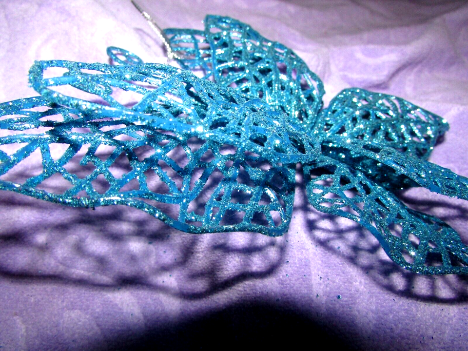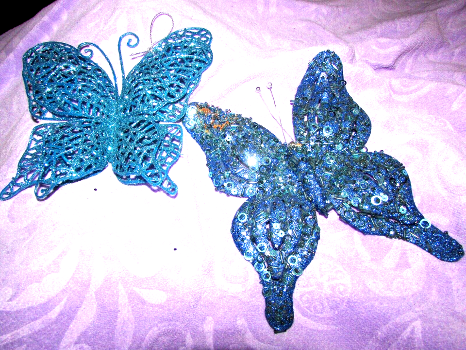 Add a touch of elegance to your home with these two beautiful butterfly decorations. One is medium-sized in a stunning shade of turquoise and features two layers of wings, while the other is a dark turquoise sequined butterfly. Perfect for any occasion, these decorative items are made of plastic and sequins and come in a set of two. Featuring the theme of butterflies, they are sure to add a charming touch to your home decor. These decorations are sold as-is and are ready to enhance your space.