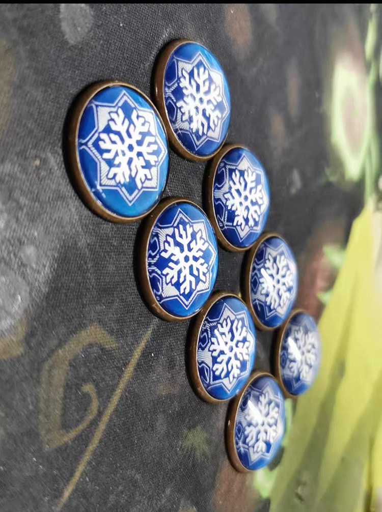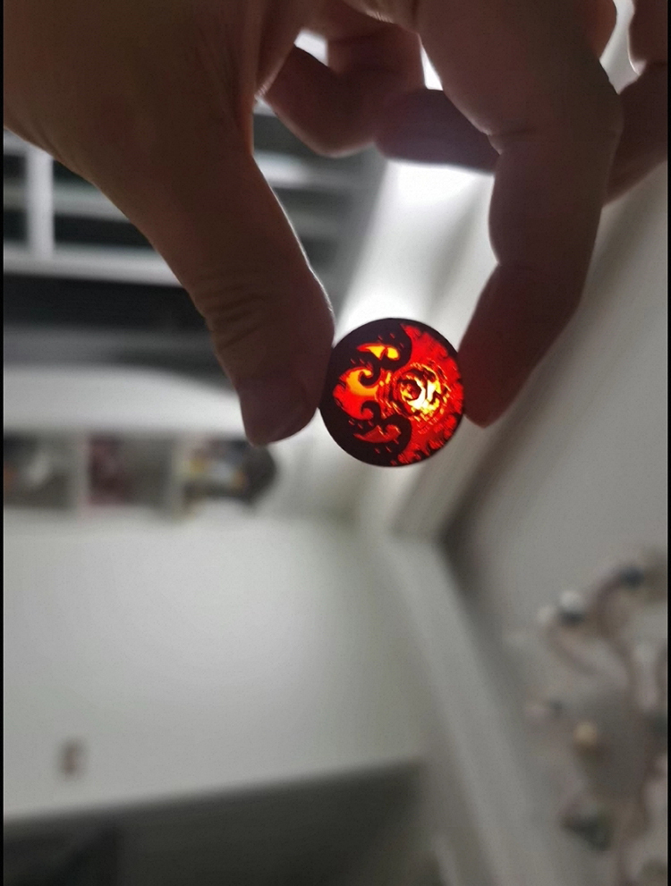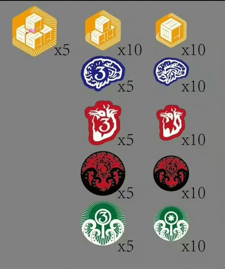 The resource tokens are made of colorful transparent acrylic, and the chaos tokens are made from glass and metal.