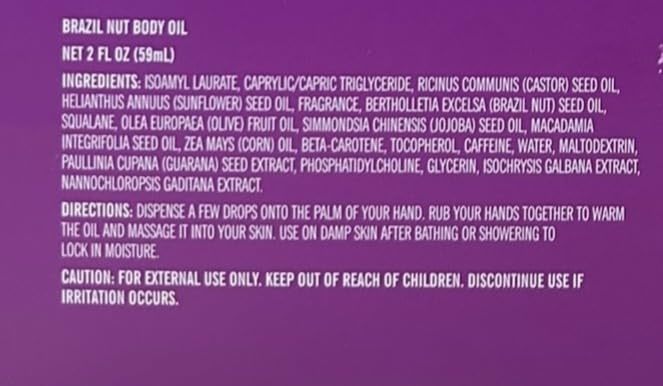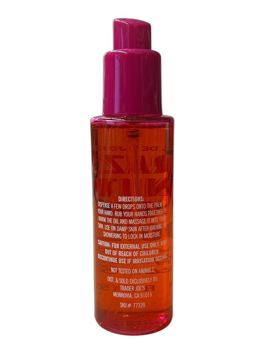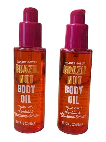 Product description: Indulge your skin with Trader Joe's Brazil Nut Body Oil, now available in a generous 2-ounce bottle . This luxurious body oil combines a nourishing base of Brazil Nut, sunflower, olive, macadamia, and jojoba oils with powerful hydration boosters including Squalane and Guarana Extract. The lightweight, super-hydrating formula absorbs quickly to lock in moisture all day long, making it the perfect post-shower or bath treatment. Just a few drops transform dull, dry skin into soft, supple, beautifully scented skin. The alluring fragrance, made famous by the Brazil Nut Body Butter line, adds a touch of indulgence to your daily skincare routine. Suitable for normal skin and designed for adult use, this travel-sized oil comes in a liquid double-sealed bottle for convenience and safety. For external use only. Experience the difference that premium oils and targeted hydration can make in achieving radiant, moisturized skin that feels as good as it smells.