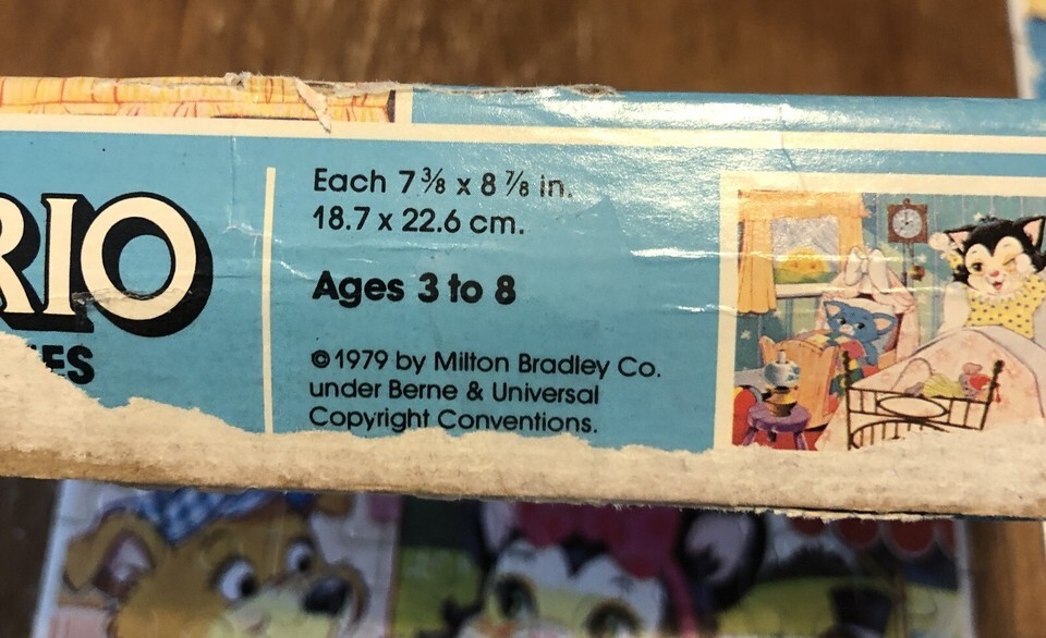 This is a Vintage TRIO PUZZLES Children PUZZLE Set of 3. Made by Milton Bradley in 1979. Each Puzzle has 48 Pieces. Puzzles Measure 7 3/8 inches by 8 7/8 inches size. Puzzles are in great condition. Box has some wear from use. EAG