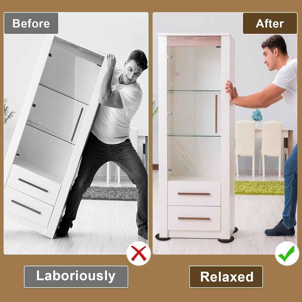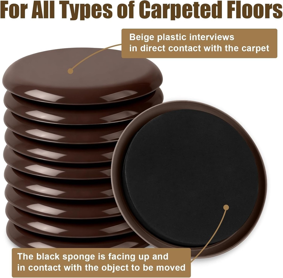 Easy to slide: The brown plastic side of the furniture slider is in direct contact with the floor/carpet, the thickened EVA foam firmly grips the item you need to move, and the furniture can be moved with ease, very silky smooth.