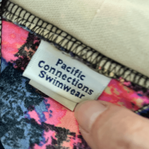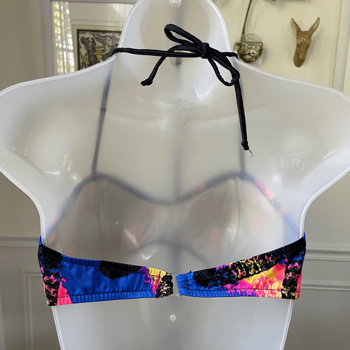 80s St Tropez Pacific Connections Swimwear bikini. High waist cut high on the hip. Back neck tie and back single hook. Totally 80s cobalt blue background with a very 80s print in electric shades of fuchsia, yellow, orange and black. Tag size 13/14, but that is vintage sizing. Lay flat the bottoms way measure 13 inches straight across the waist stretching to 16 inches without much resistance. 12 inch rice. The top is not padded, but it does have boning to accommodate cup size and measures 14 inches armpit to armpit stretching to 18 inches without much resistance.
