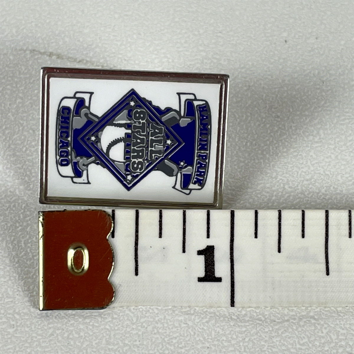 This is a vintage lapel pin featuring the "Hamlin Park All Stars Chicago" baseball theme. The pin is crafted from metal with vibrant enamel fill, showcasing a classic design with a baseball and crossed bats. The design prominently displays "ALL STARS" in a diamond shape, flanked by banners reading "HAMLIN PARK" at the top and "CHICAGO" at the bottom. This collectible pin measures approximately 1 inch in length and 0.75 inches in width, making it a perfect size for a jacket, hat, or display. The backing features a post with a clutch for secure attachment. This listing includes one (1) pin as pictured, identified on the reverse with "Proudly Made in U.S.A.". It's a fantastic piece of vintage sports memorabilia, ideal for collectors of Chicago baseball history or local league collectibles.