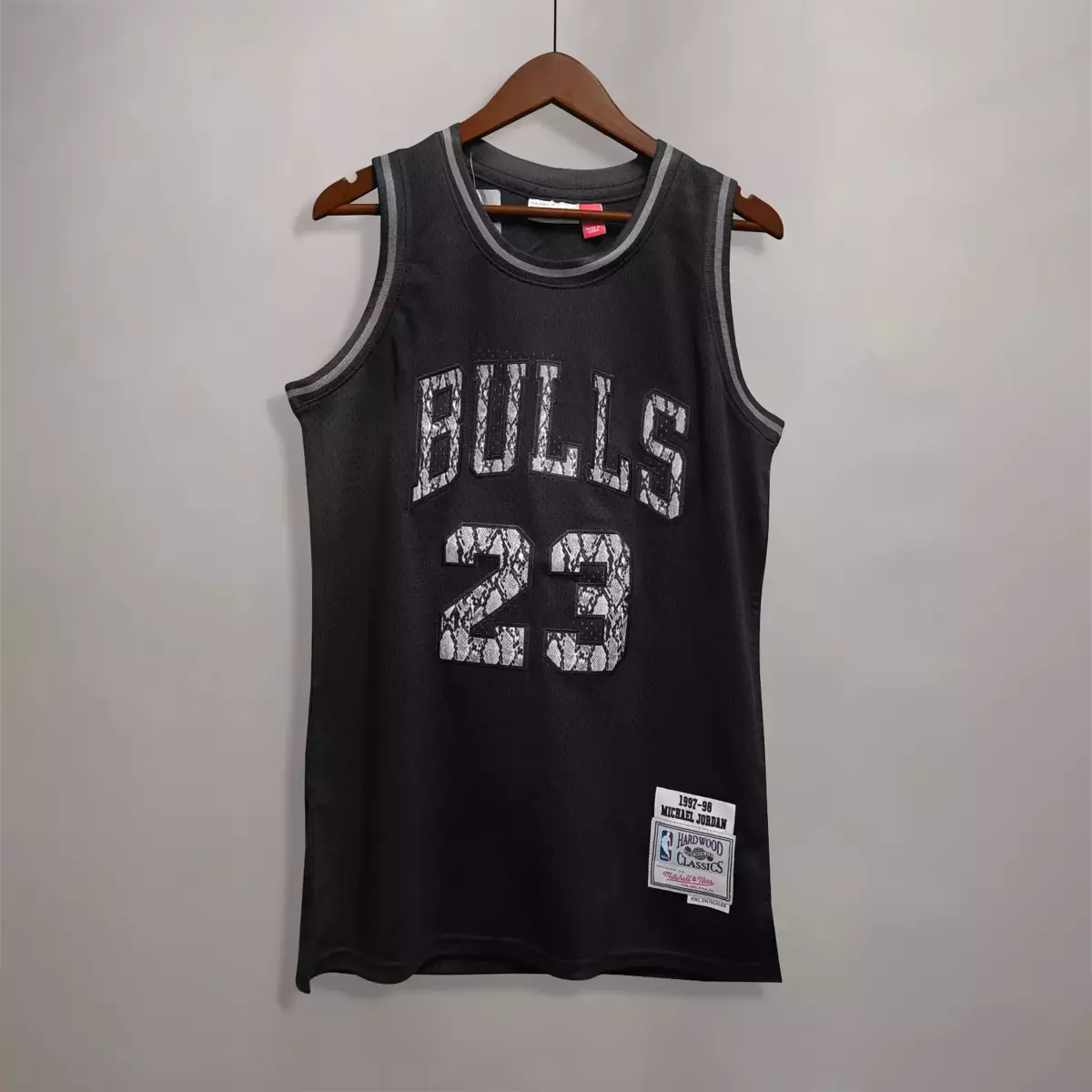 Own a piece of basketball history with this unique Michael Jordan #23 Chicago Bulls Jersey. This "Hardwood Classics" edition features a rare black snakeskin-textured print on the letters and numbers, giving the GOAT’s jersey a high-end, custom look.