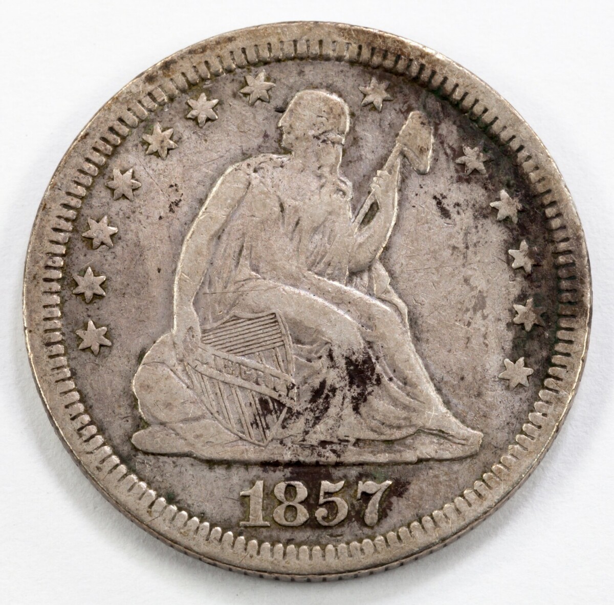1857 25C Seated Liberty Quarter in Fine+ Condition, LIBERTY Bold and Clear