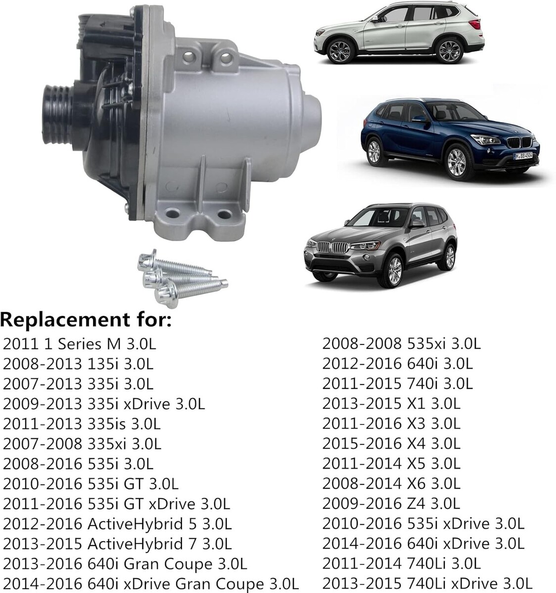 ??Fitment?: Replacement for 2014-2016 for BMW 640i xDrive Gran Coupe 3.0 L6 F06; Replacement for 2011-2014 for BMW 740Li 3.0 L6 F02; Replacement for 2013-2015 for BMW 740Li xDrive 3.0 L6 F10; Replacement for 2011-2015 for BMW 740i 3.0 L6 F01; Replacement for 2012-2016 for BMW ActiveHybrid 5 3.0 L6 F10; Replacement for 2013-2015 for BMW ActiveHybrid 7 3.0 L6 F02; 2013-2015 X1 3.0L / 2011-2016 X3 3.0L / 2015-2016 X4 3.0L / 2011-2014 X5 3.0L / 2008-2014 X6 3.0L / 2009-2016 Z4 3.0L