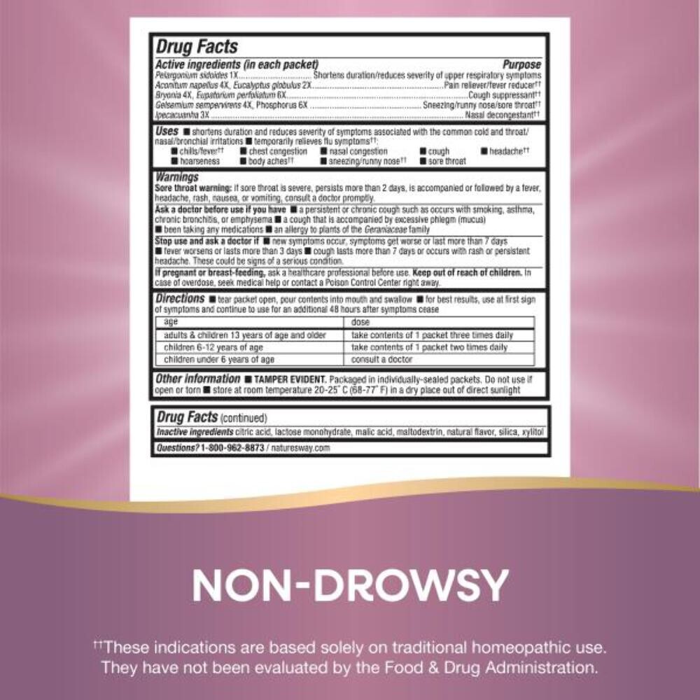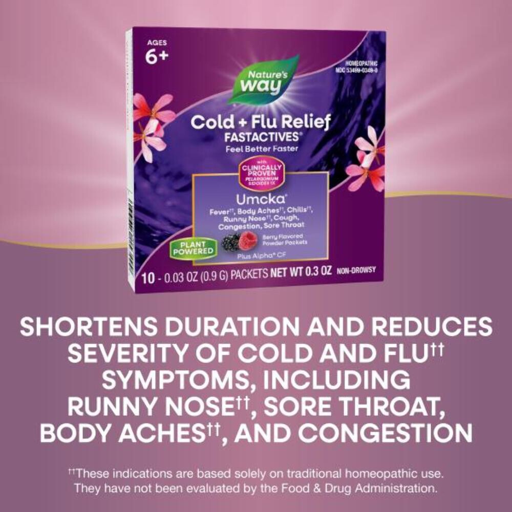 8/26 Nature's Way Cold + Flu Relief FastActives, Umcka, Homeopathic, Fever*, Sore Throat, Cough, Congestion, Phenylephrine Free, Non-Drowsy, Berry Flavored, 10 Packets (Packaging May Vary) (Copy)