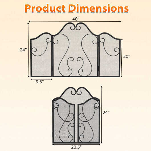 3 Panel Fireplace Screen Foldable Spark Guard Cover with Decorative Scroll