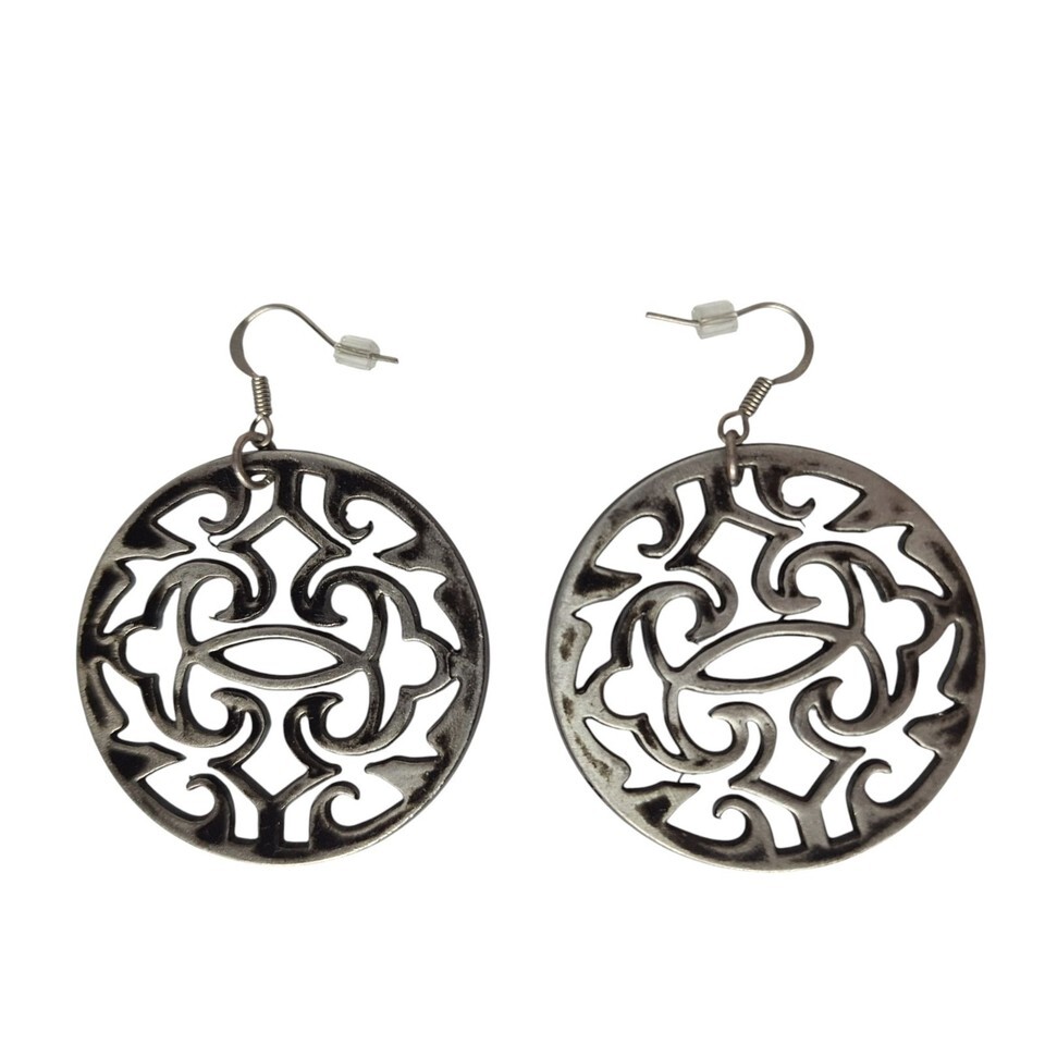 Vtg Silver Tone Filigree Dangle Earrings Ornate Cut-Out Swirl Design Boho Chic