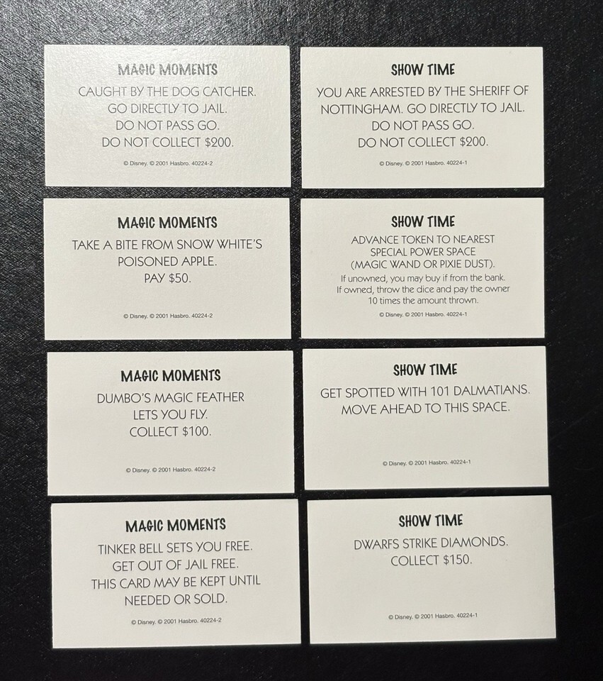 Disney Edition Monopoly Replacement Pieces: 4 Magic Moments + 4 Show Time Cards