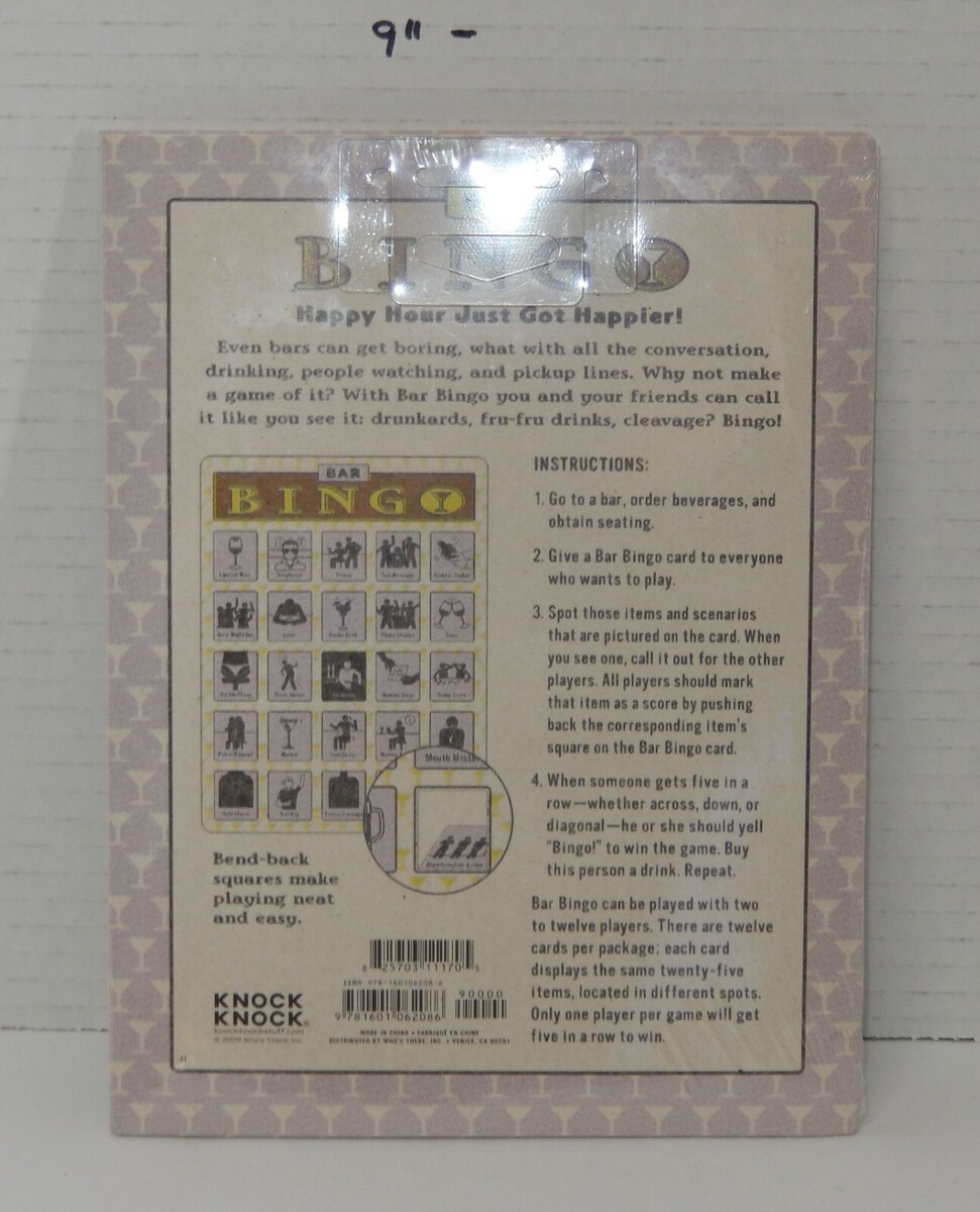 For Sale is a 12 Card Bar Bingo by Knock Knock Whos There. Its in good USED condition. Please see photos for more details. Please ask Any and All Questions prior to purchasing. Fast Same or Next day shipping with Free Delivery Confirmation within the U.S. Payment Due within 7 days of purchase (if you need more time please let us know In advance) we love to combine shipping is always a Yes and Most of the time Additional Items Ship for free.