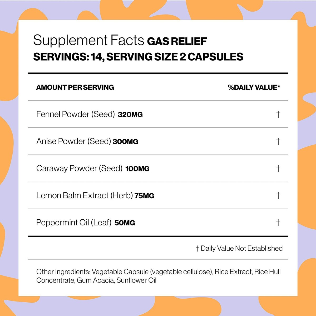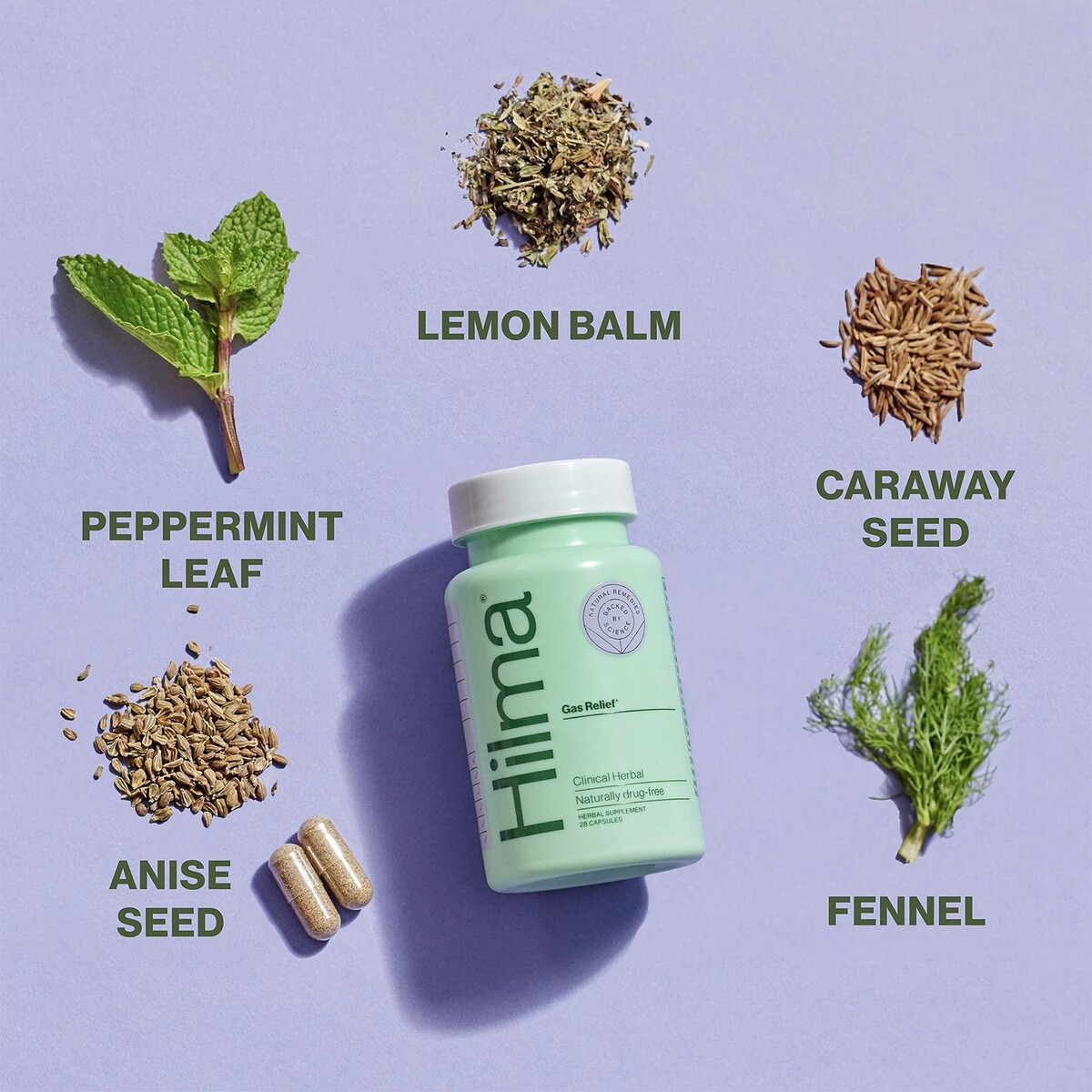 Expiration Date of 11/2026 ? BLOATED? - Get effective gas bloating relief, naturally. Hilma Gas Relief uses herbs that break up intestinal gas to help calm soothe the digestive tract. Translation? Relief you can feel (not hear).* ? SAFE EFFECTIVE - Includes 5 herbs clinically proven to relieve gas bloating: Peppermint Leaf, Fennel, Lemon Balm, Caraway Anise.* Always 3rd-party lab tested. ? PERFECT FOR - After a big meal, that time of the month, or while traveling. Take 2 easy-to-swallow capsules as needed. ? ONLY THE BEST INGREDIENTS - Naturally drug-free, Non-GMO, Gluten Free, Vegan, Cruelty Free, Nut Free, Soy Free. No synthetic colors, fillers, dyes, sweeteners, or flavors. ? HILMA?S STORY - We are a women-owned and led company that believes in creating a new standard for medicine cabinet staples--natural remedies that are backed by scientific evidence and formulated with the highest quality ingredients. We guarantee 100% happiness on every order.