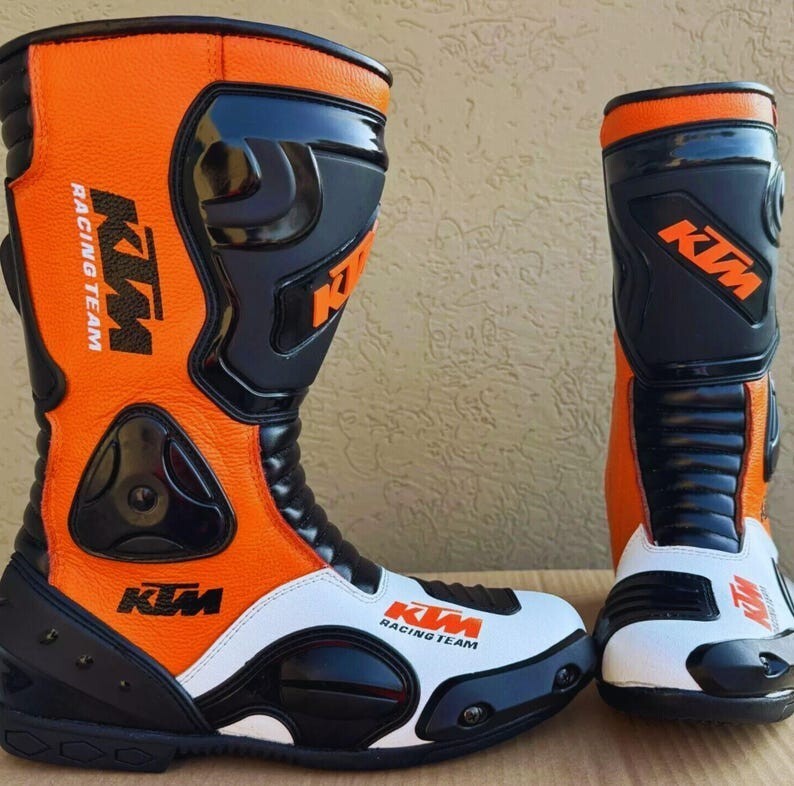 Step into the world of speed, performance, and protection with KTM Racing Team Motorcycle Boots ? a perfect fusion of style and safety for serious riders. Expertly handmade from 100% genuine leather, these boots are designed for racing professionals, MotoGP enthusiasts, and everyday riders who demand premium quality and comfort.