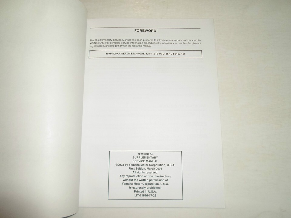 Manuel De Service Supplementaire Yamaha YFM450FAS 2004 D'Usine OEM LIVRE 04 DEAL