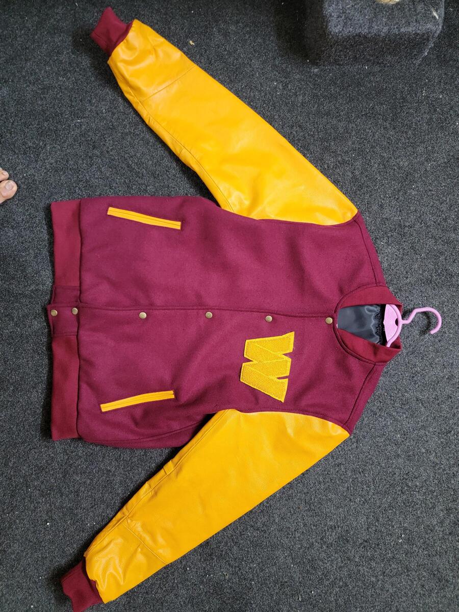 Classic Varsity Design: Features a rich burgundy/maroon body with contrasting bright gold/yellow sleeves.