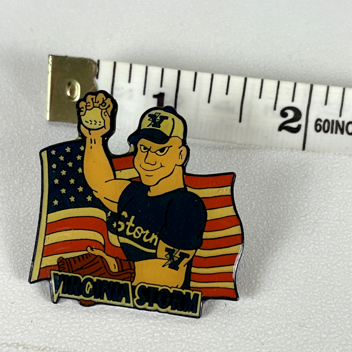 This is a vintage enamel pin featuring the Virginia Storm baseball team. The design showcases a strongman or baseball player mascot in a cap with a 'V' logo, holding a baseball, with a baseball glove and an American flag in the background. The team name "Virginia Storm" is prominently displayed at the bottom of the pin. This collectible sports memorabilia piece is made of metal with an enamel finish, giving it a vibrant and durable design. It is perfect for collectors of vintage baseball pins, lapel pins, or hat pins.
