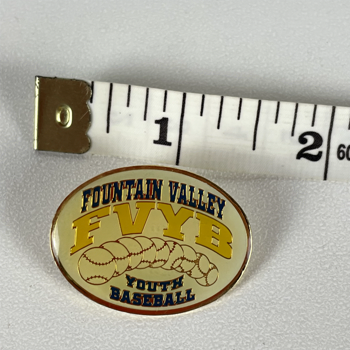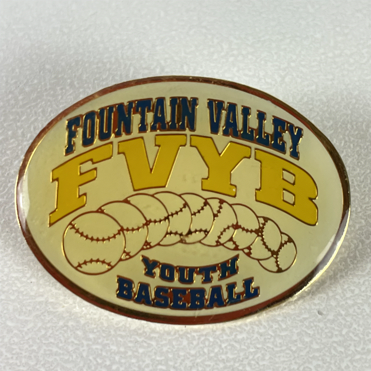 This is a vintage enamel pinback lapel pin featuring the "FOUNTAIN VALLEY YOUTH BASEBALL" logo. The pin showcases an oval design with a cream background, bold yellow "FVYB" lettering, and blue "FOUNTAIN VALLEY" and "YOUTH BASEBALL" text. A row of baseballs is depicted across the center, adding to its classic sports memorabilia appeal. This collectible pin measures approximately 1.75 inches in length and 1 inch in width. The backing features a standard pin post with a butterfly clutch for secure attachment, making it perfect for jackets, hats, or display.