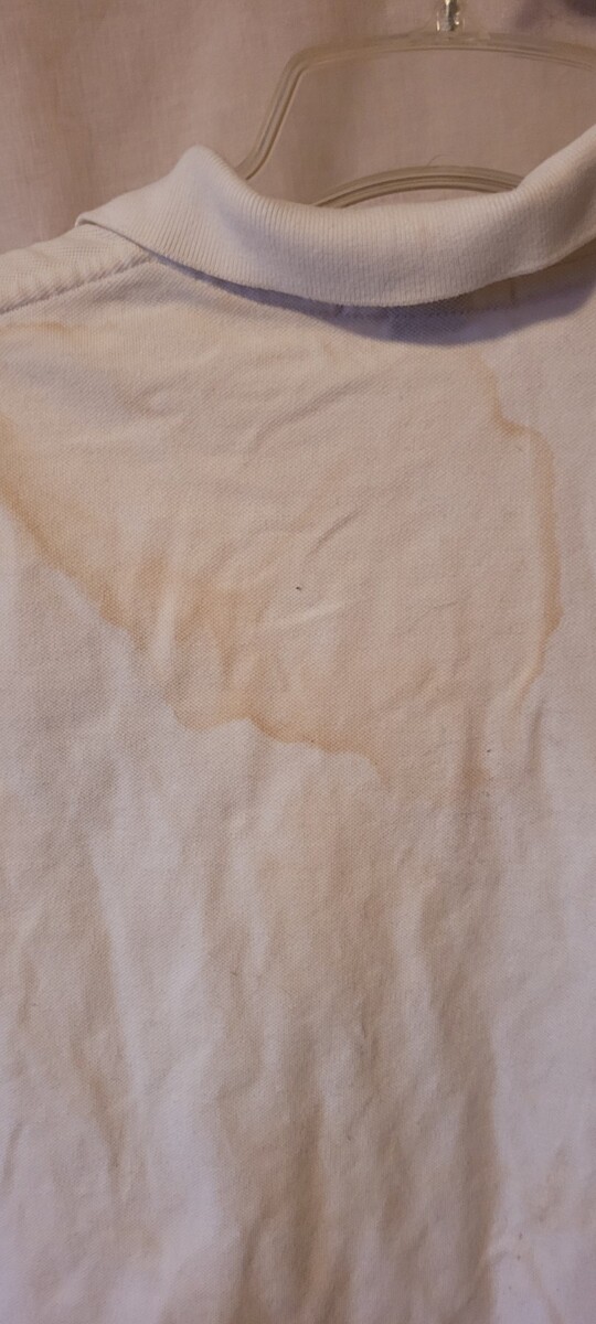 This shirt is in well-worn condition. As seen in the photos there are a lot of stains. Not sure if they would come out if it was more aggressively cleaned. We do not do aggressive cleaning due to people having sensitive skin and allergies. The size is Large. Measurements are aproximatley: Length: 28 inches. Pit to Pit: 23 inches.