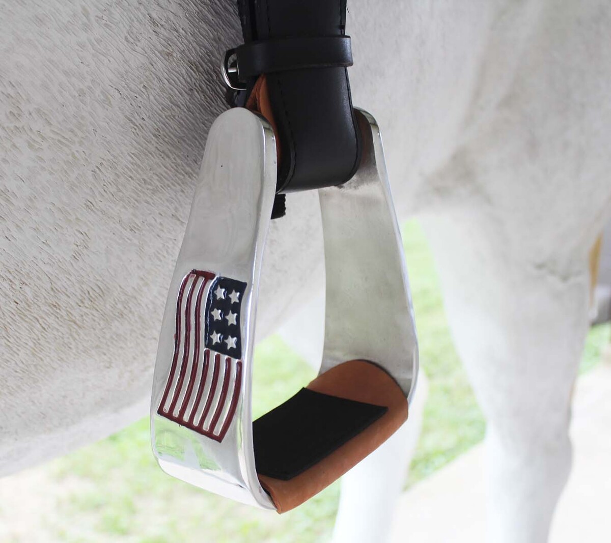 Challenger western stirrups made from lightweight aluminum. Accented with an American flag inlay on each outer sides. Features leather accents and a rubber grip tread to help prevent slippage. The slanted design allows for your foot to hang in a more natural position. The outside of the stirrup is longer than the inside to relieve pressure from your knees with your feet parallel to the ground. Great choice for a trail ride! Stirrups measurements are as follows; 5" Width, 5" Height, 3" Neck, 2-3/4" Tread.