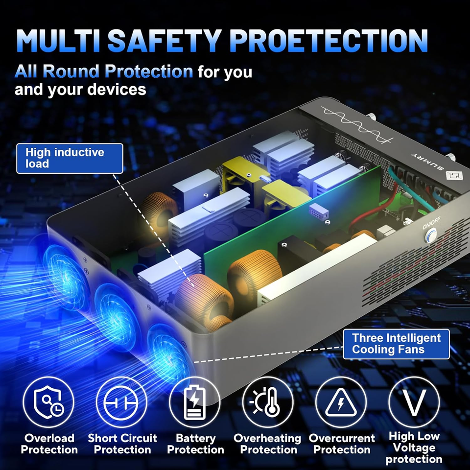 Safe and Reliable: Built-in three cooling fans. Multiple protections for overload, overheat, over current, short circuit. One-key restoration to default settings. Smart battery charge design to optimize battery life