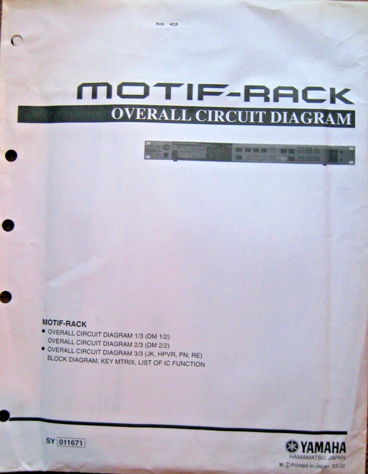 Original Yamaha set of overall circuit diagrams for the Yamaha MOTIF-Rack rack mounted synthesizer / tone generator. This is the large overall circuit diagram sheets, all tucked into an original Yamaha service envelope with holes on one side of it for placing it into a binder if you wanted to do so. Lightly used but very good condition, the folder has some folds from storage wear. These