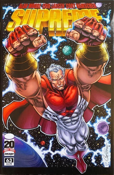 *(Writer) Alan Moore. (Artist) Erik Larsen Cory Hamscher./ 'REVELATIONS' The legendary Supreme returns! ALAN MOORE's final SUPREME tale is the ultimate jumping on point for new readers! The triumphant return of Image Comics' most powerful hero! As Supreme romances Diana Dane he takes her on a tour of the Citadel Supreme and tells all of his innermost secrets just as Supreme's most hated nemesis, Darius Dax, makes a most unfortunate discovery: the key to defeat his abhorred adversary! It's most mind-blowing cliffhanger in the history of comics! Featuring a story by award winning author ALAN MOORE (WATCHMEN) and art by fan favorites ERIK LARSEN (SPIDER-MAN, SAVAGE DRAGON) CORY HAMSCHER (X-MEN). You wish all comics were this good!