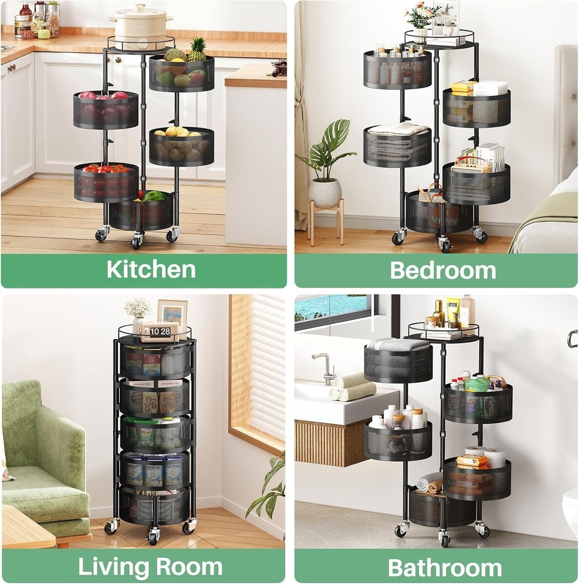 5-Tier Rotating Fruit Basket - Durable Metal Storage Rack with Wheels, Black