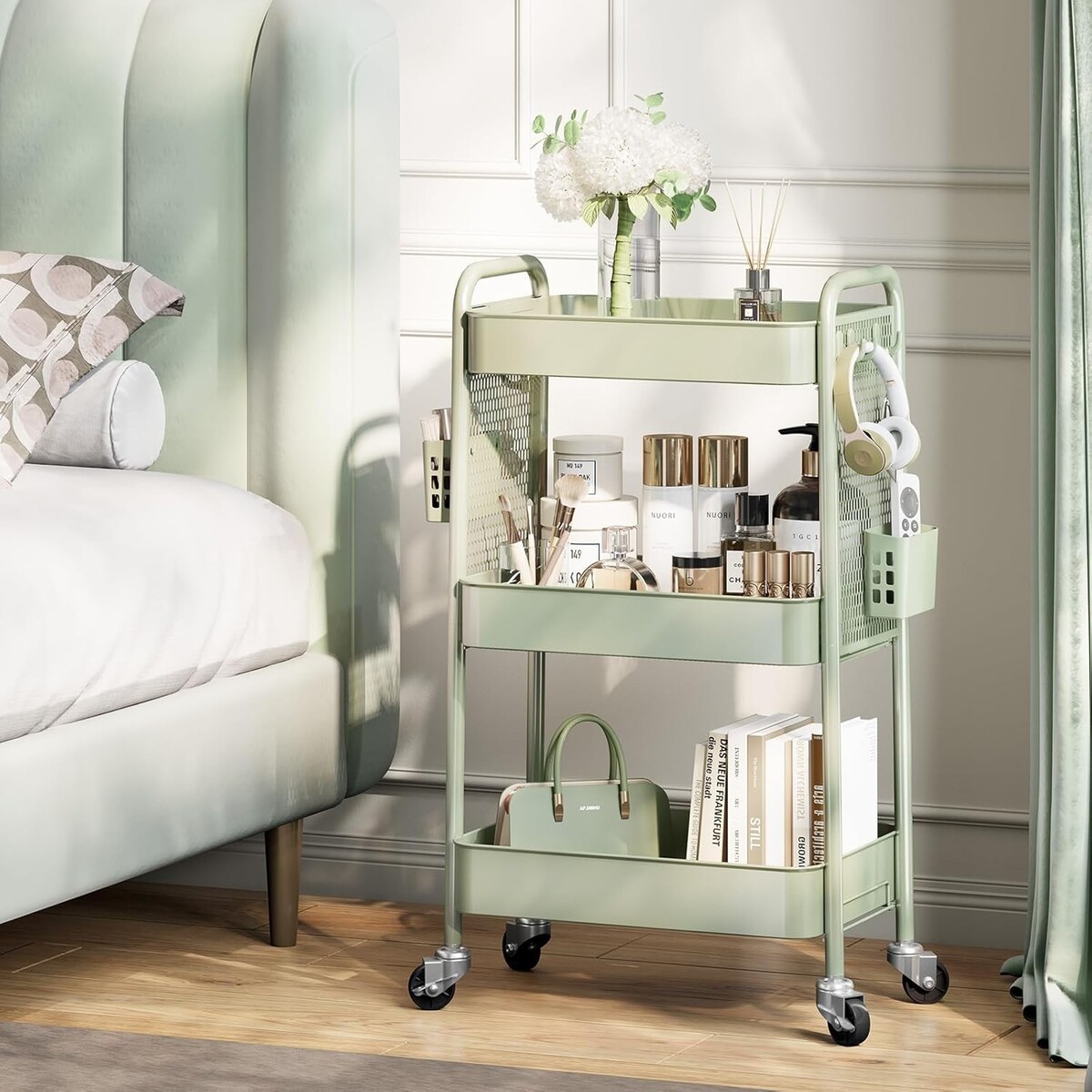 Effortlessly elevate your organization with our versatile 3-tier rolling cart, the perfect solution for effortlessly managing your household items.