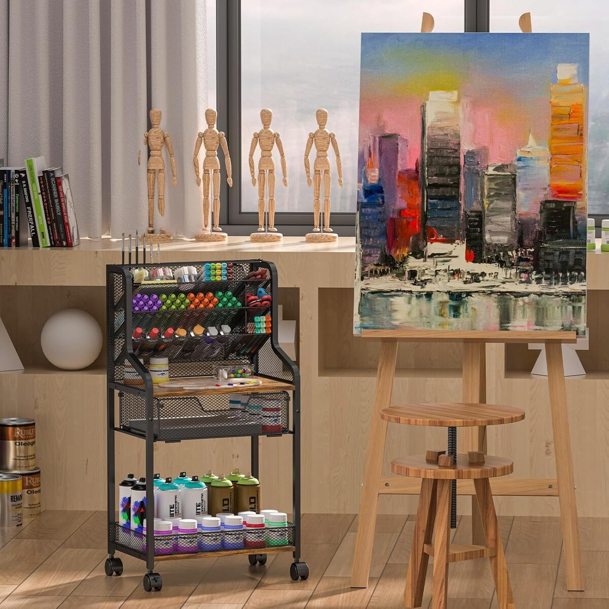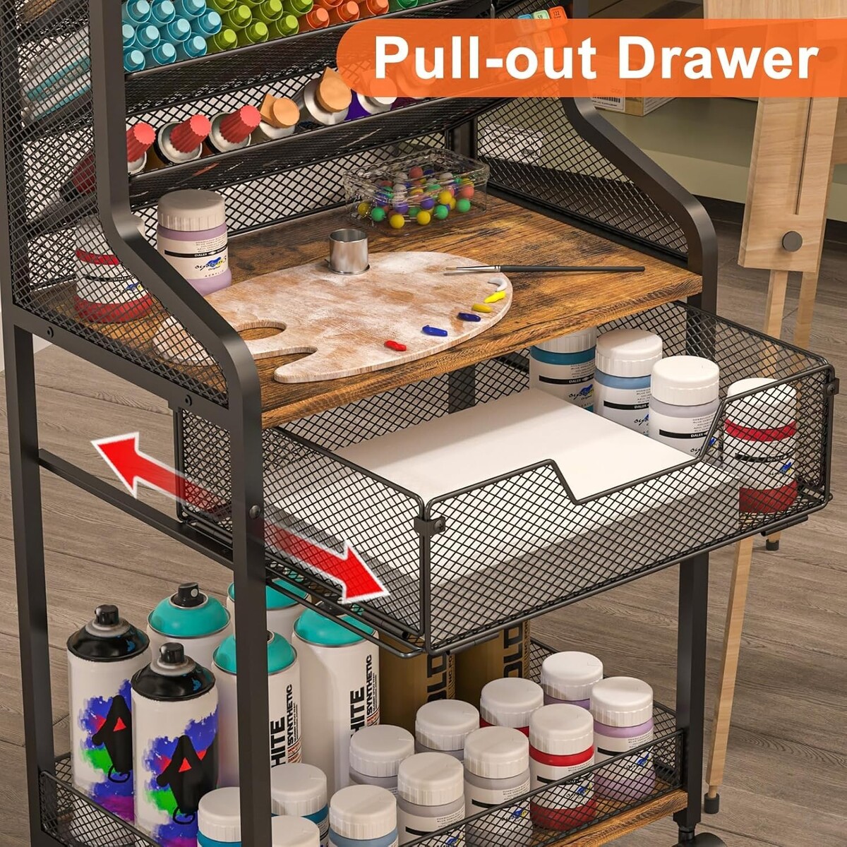 Durable Construction: Crafted from high-quality metal and wood, this cart features a bottom rim to securely hold your paints in place during transport, offering excellent load-bearing and stability.