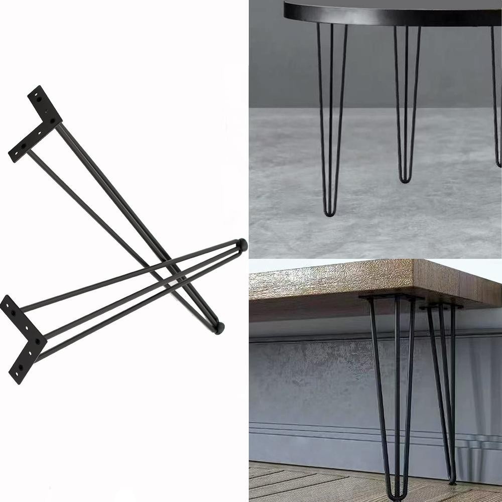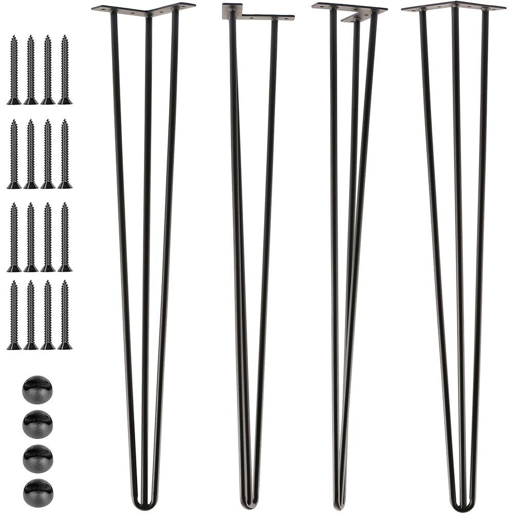 SPACEUP Hairpin Table LegsThe table legs uses thick steel as raw material with black powder-coated processing, which can be used for many kinds of DIY designs, such as desks, benches, and other piece of furniture.key FeaturesRELIABLE TABLE LEGS Product Height: 28 inch; Quantity: 4 PCs; Color: Black; Tube Thickness: 3/8". The 28" hairpin table leg is made of carbon steel. Three-rod design makes it much more stable. The leg takes powder coating craft, which makes it anti-rust smooth on the surface.HEAVY DUTY CAPACITYEach of the desk legs can hold Max. 220 lbs load. So the four legs together can carry up a weight of 880 lbs. They are stronger than other two rods hairpin table legs. It is heavy-duty and solid enough meet your needs.THOUGHTFUL DESIGNWe offer four rubber cover. Use them to protect floors from scratches or other damage. In addition, they also have a good anti-slip effect.SIMPLE INSTALLATIONThe 4.3"x4.3" mounting plate has four f6 mm pre-drilled holes and we offer enough screws. You only need to use an screwdriver to fix the screws into the wooden plate. So, the installation is quick and time-saving.VARIOUS APPLICATIONThe hairpin table legs are suitable for many kinds of DIY designs, such as desks, benches, and other piece of furniture. You can use the legs to decorate different kinds of furniture of your home, garden and corridor. Take them to make your home more fashionable and modern.SpecificationsColor: BlackMaterial: Steel Quantity: 4 PcsHeight: 28"Package Content 4 x Hairpin Table Legs4 x Rubber Floor Feet16 x Standard Screws